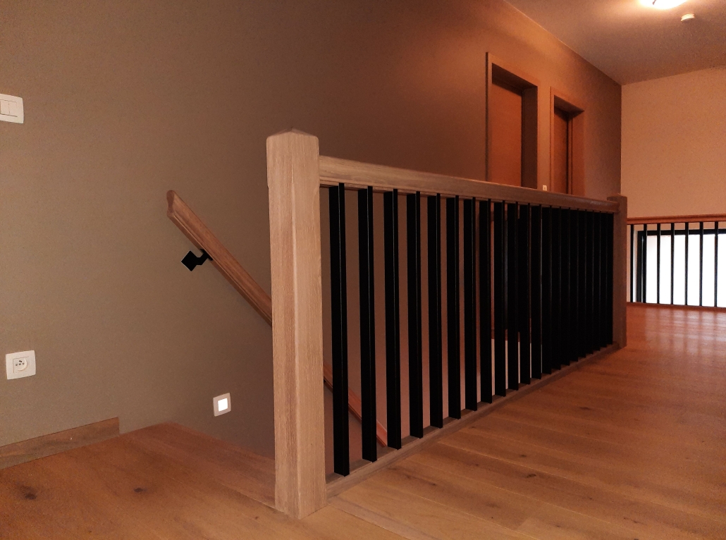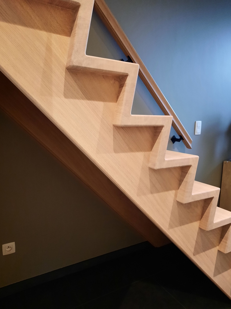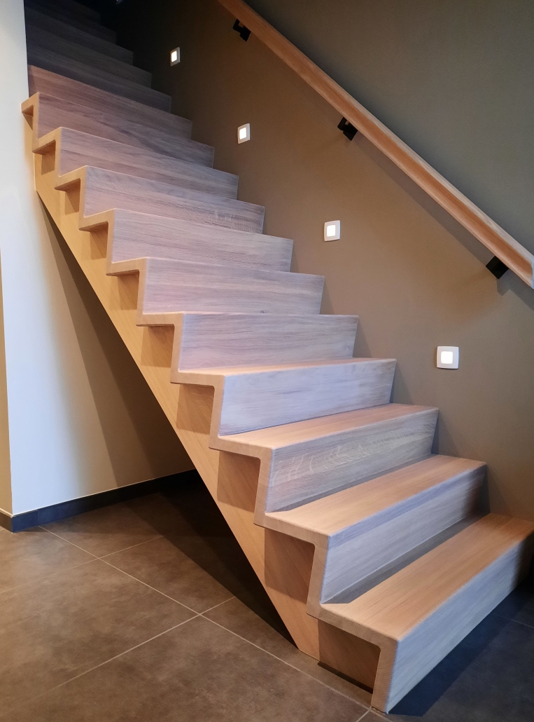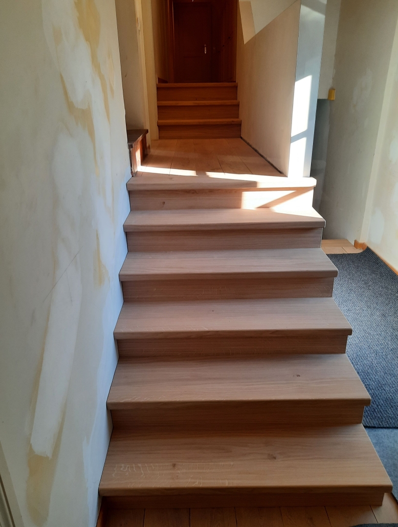 Een trap bekleed met hout geeft een warme uitstraling aan uw interieur, zowel klassiek als modern. Wij werken met verschillende houtsoorten zoals den, eik, beuk,…en werken uw trap af met een olie die een duurzame bescherming bied en waarbij u keuze heeft uit een ruim kleurenpalet.